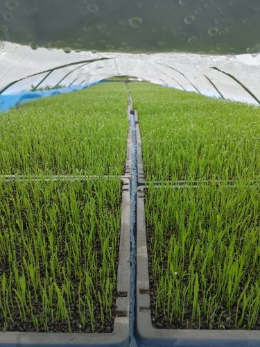 芽出しできた籾種を苗箱に撒いてプールに並べ保温シートを被せます